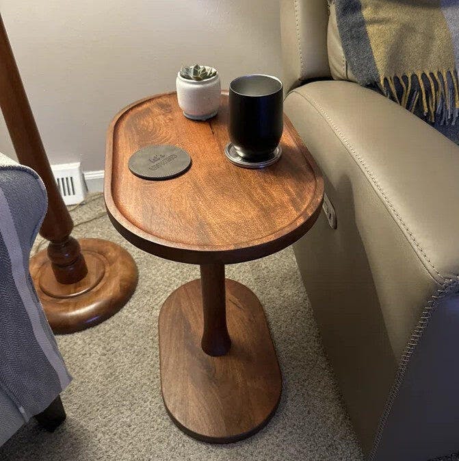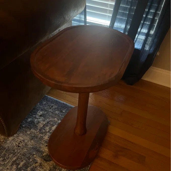 A Scandinavian stunner. Crafted from solid wood, this end table features oblong top and base conjoined via a rounded pedestal leg. The tray top is bordered with a raised lip around the edge to keep things in place. Whether you’re sipping coffee or hosting happy hour, this one will be your sturdy side kick!