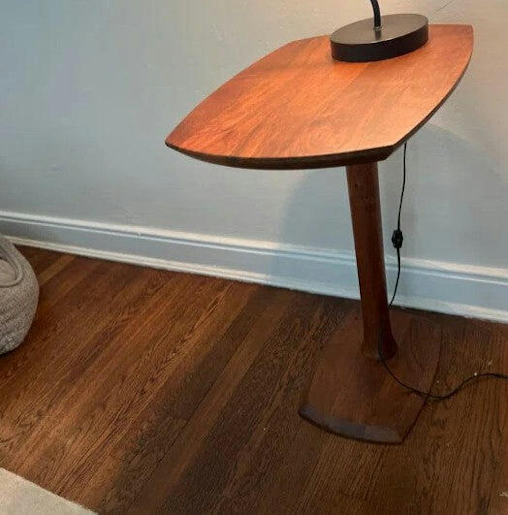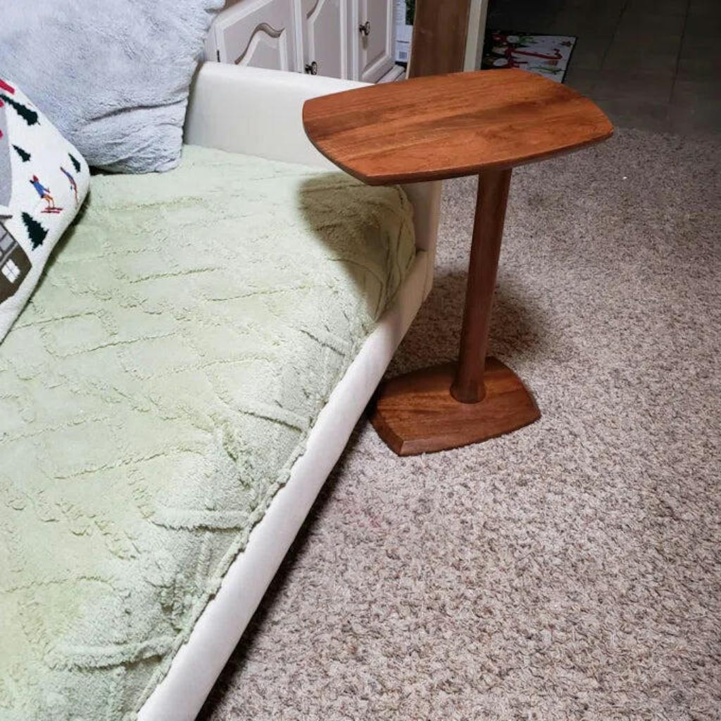Slide 'n' Hide. Solid wood all over, this end table comes with boat-shaped parallel planes that have chamfered edges for a Scandinavian look! Space-saving c-type design paired with sturdy pedestal leg lets you effortlessly slide it under a sofa, couch, or bed. Your snacks, beverages, remotes, or favorite books are at a quick reach.