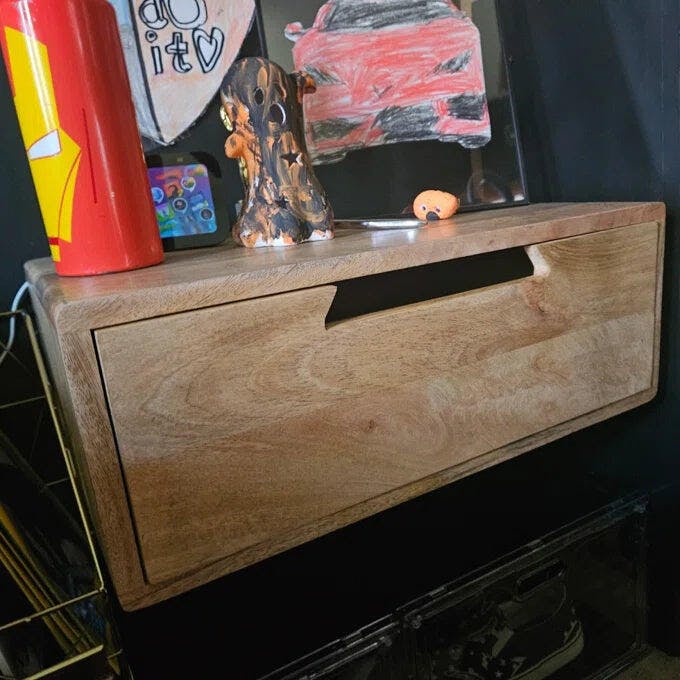 Scandi, seamless & sturdy – meet this floating nightstand. Kiln-dried solid wood all over, this piece has the handcrafted quality we love. Designed with a spacious drawer featuring a trapezium-shaped cutout for a stylish yet easy opening. Its off-the-floor design provides plenty of room for movement. What more? Comes pre-assembled so just install & perch your night-time must-haves.