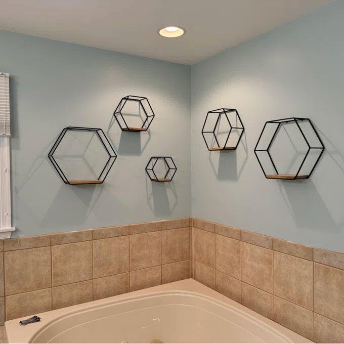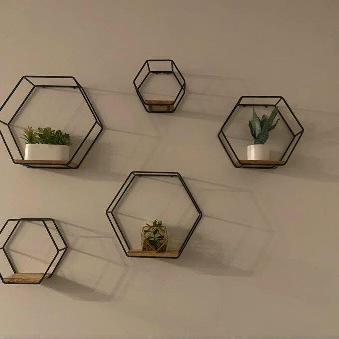 Set of 5 hexagonal shelves offer a stylish and functional solution for modern spaces. Crafted using powder-coated metal and solid wood, the shelves features sleek frame and a sturdy plank. Arrange the shelves together in a set or hang separately. Ideal for displaying plants, books, or decor objects, this shelving unit blends craftsmanship with contemporary beauty.