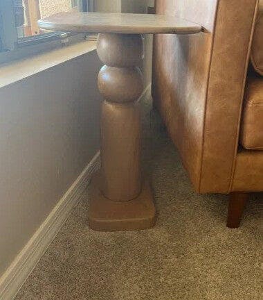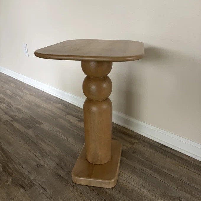 Sculptural silhouette at its best! Crafted using solid natural wood, this end table features a oblong top and flat base ensuring stability. We love the curvilinear leg consisting of spherical elements that add a subtle floating effect! Artistic look paired with functionality, you can style this end table in your living or bedroom, offering a reliable surface for your favorite decorative items or essentials. Best part? It is super easy to assemble!